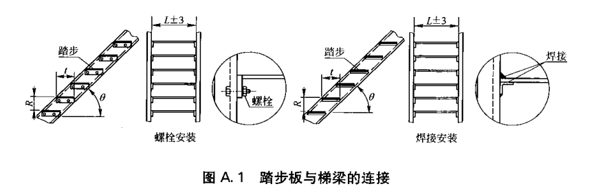 (8)踏步板與樓梯的鏈接采用焊接或螺栓固定,見(jiàn)圖A.1。采用螺栓固定時(shí),螺栓規(guī)格不得小于M10。